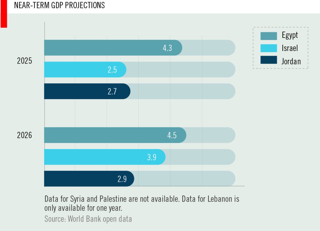 Key economic data for the six polities and jurisdictions yield limited or indirect information on the impact of armed interstate and asymmetric Arab-Israeli conflicts and specifically the October 7, 2023 Hamas intrusion into Israel, Israel’s state actions against the Gaza strip with the declared rationale of smashing Hamas, the aggression of militant Hezbollah and Houthi entities from Lebanon and Yemen, the confrontations between Israel and Iran, the Israeli pummeling of Lebanon, the Israeli actions vis-à-vis post-Assad Syria, and all related destruction or economic damage. The data and indicators in the infographic overleaf do, however, illustrate the economic productivity and the global perceptions thereof in the last fifty years, the last decade, and the current outlooks and perceived potentials. As shown in the data, the disparities between countries are blatant, signs of regional integration of Mashreq or Near Eastern, economies, are absent.