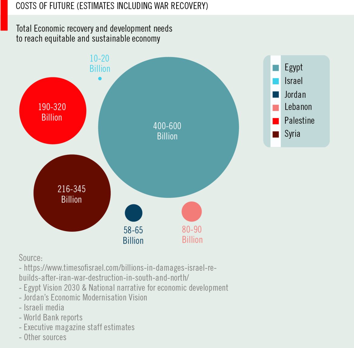 Our list of strategic sectors in the economies of the five polities have been produced from a combination of international reports and own assessments. With regard to total cost of economic recovery from conflict and/or economic return to sustainability, Executive did not come across a single credible source of information for the total cost of economic rebuilding and recovery after the October 2023-October 2025 period or any portion thereof. A mix of disparate sources and own estimations was used. All data are provided for purposes of illustrating socioeconomic realities and potentials, or the lacking thereof, and should not be relied on as baselines for economic development project plans or investments.