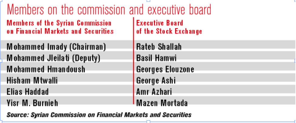 Foreign investment is not disallowed by the commission, which has, Hamwi says, adopted a “foreign investment neutral” policy. In line with the law on banks requiring 51% Syrian ownership, the same will apply to the stock exchange, and companies with foreign shareholders will have to be first approved by the prime minister’s office, which should ensure the bourse is not inundated with foreign investors.