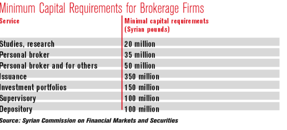 Currently some five brokerages have been licensed in addition to the Commercial Bank of Syria to handle IPOs. The commission recently granted preliminary brokerage licenses to Egypt’s Orion Holding, Jordan’s Elite Financial Services and Orouba Stock Brokers, with a further 21 applications pending, all with minimal capital requirements of SYP805 million to carry out all brokerage activities (see box).
