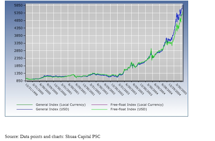 The simple truth about Gulf stock markets is that oil has gone from below $10 per barrel in the last couple of years of the 20th century to near $60 per barrel today. This has created a tidal wave of petrodollar-driven liquidity in the coffers of Gulf governments. A recent study by Saudi Arabian Monetary Agency (SAMA) reinforces this notion. The premise of the report shows how domestic spending of “high-powered money” (net domestic expenditure from oil revenues) can create liquidity several times its size (the multiplier effect), demonstrating that, in Saudi Arabia, each new oil riyal of government spending has the power to create up to SAR 16.6, or over sixteen times in additional liquidity. Between 2002 and 2004, net government spending totaled approximately SAR 575 billion, which have had the potential to generate new liquidity up to SAR 10 trillion.
